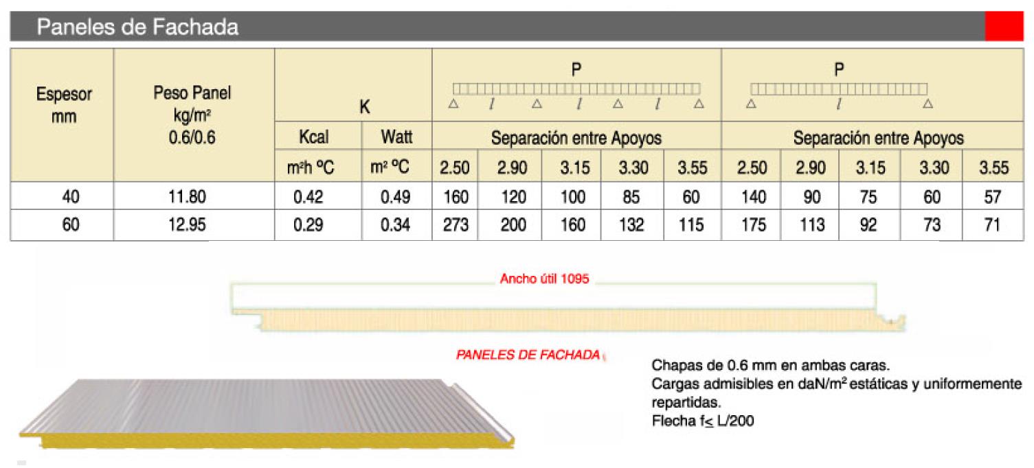 Espesores: 40, 60, 100 mm. Ancho útil 1.095mm.